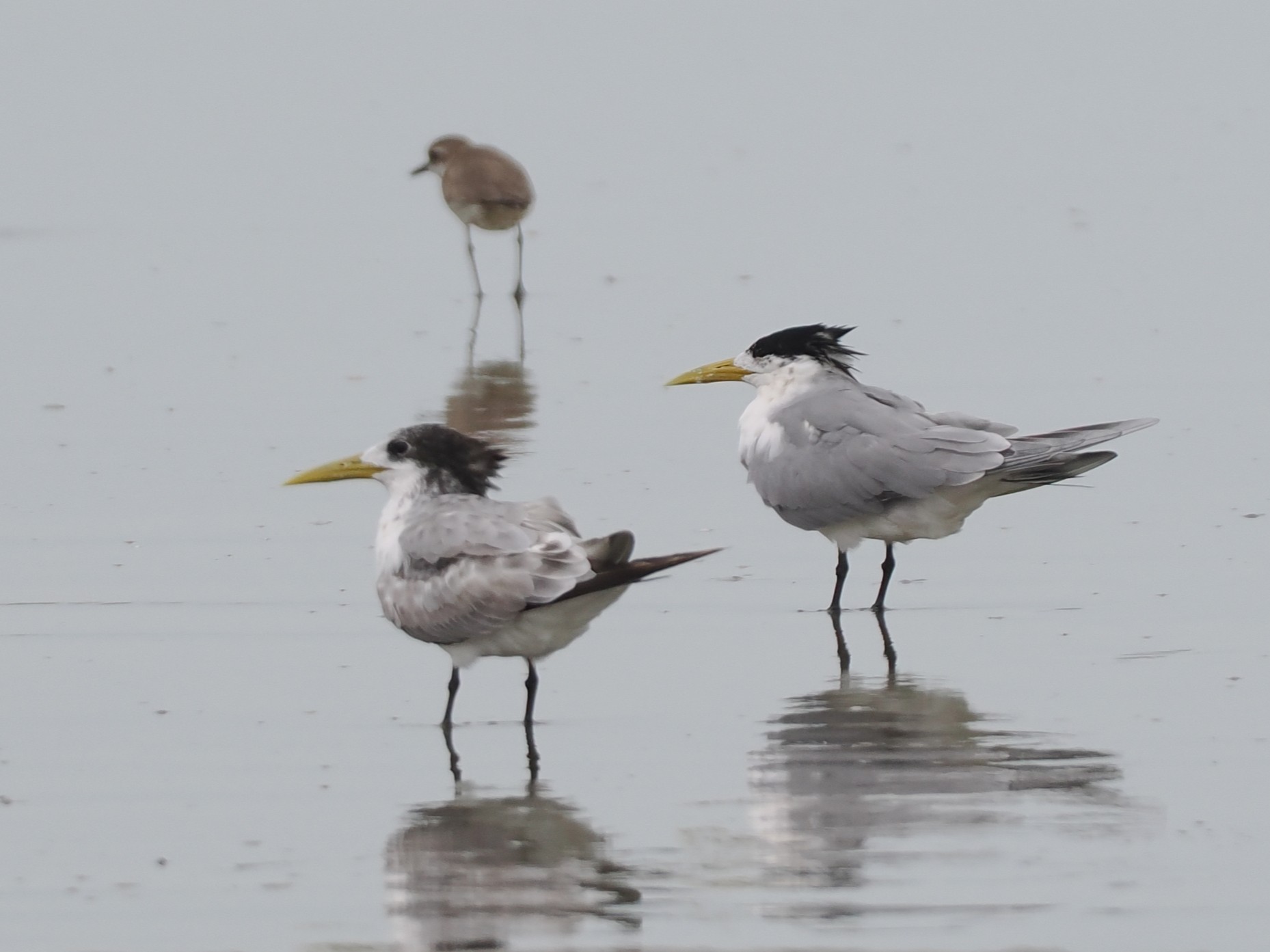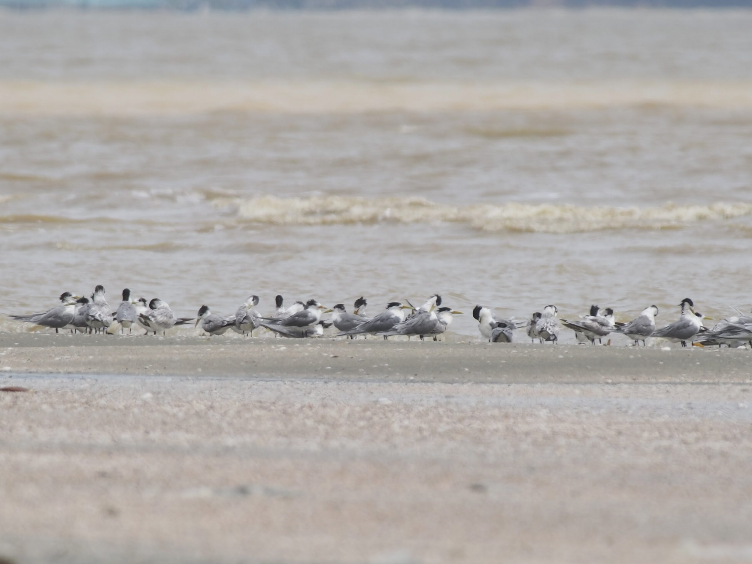 Dominating the scene were the Great Crested Terns (Thalasseus bergii), lined up along the shoreline in an orderly stretch—lounging, preening, dozing, and generally making themselves at home.