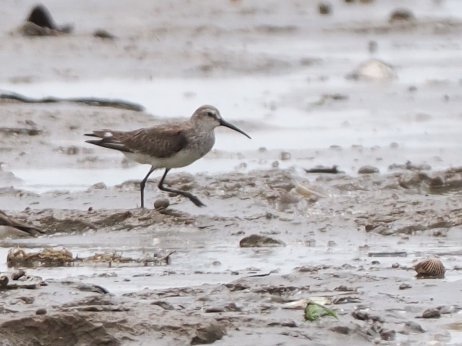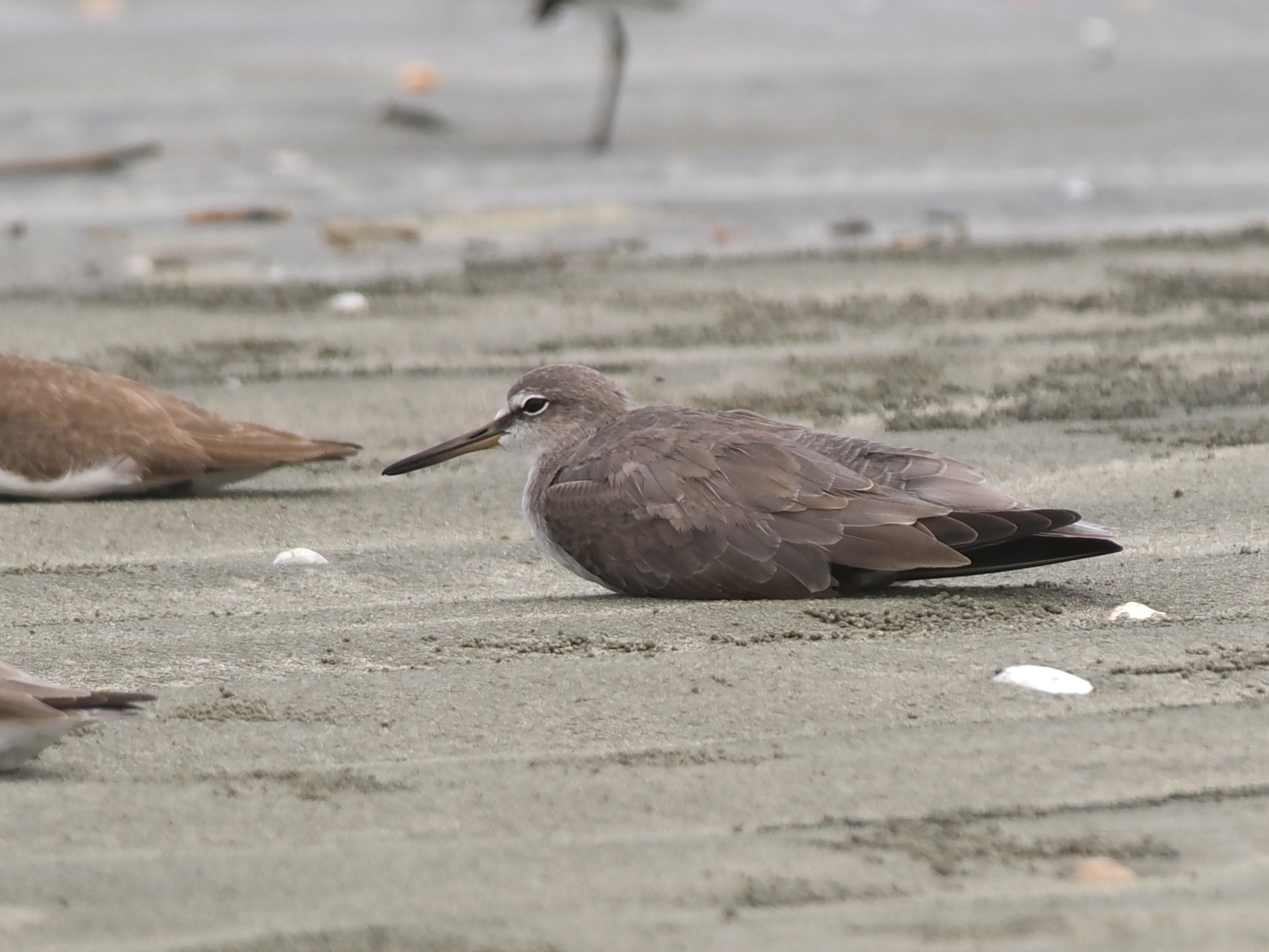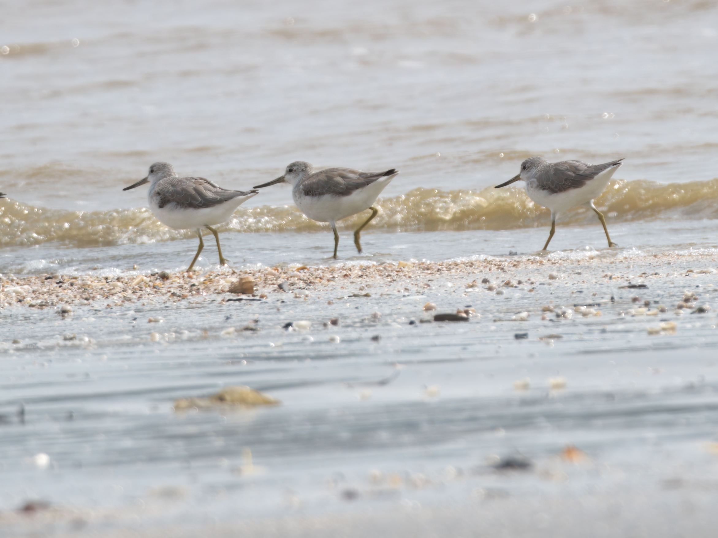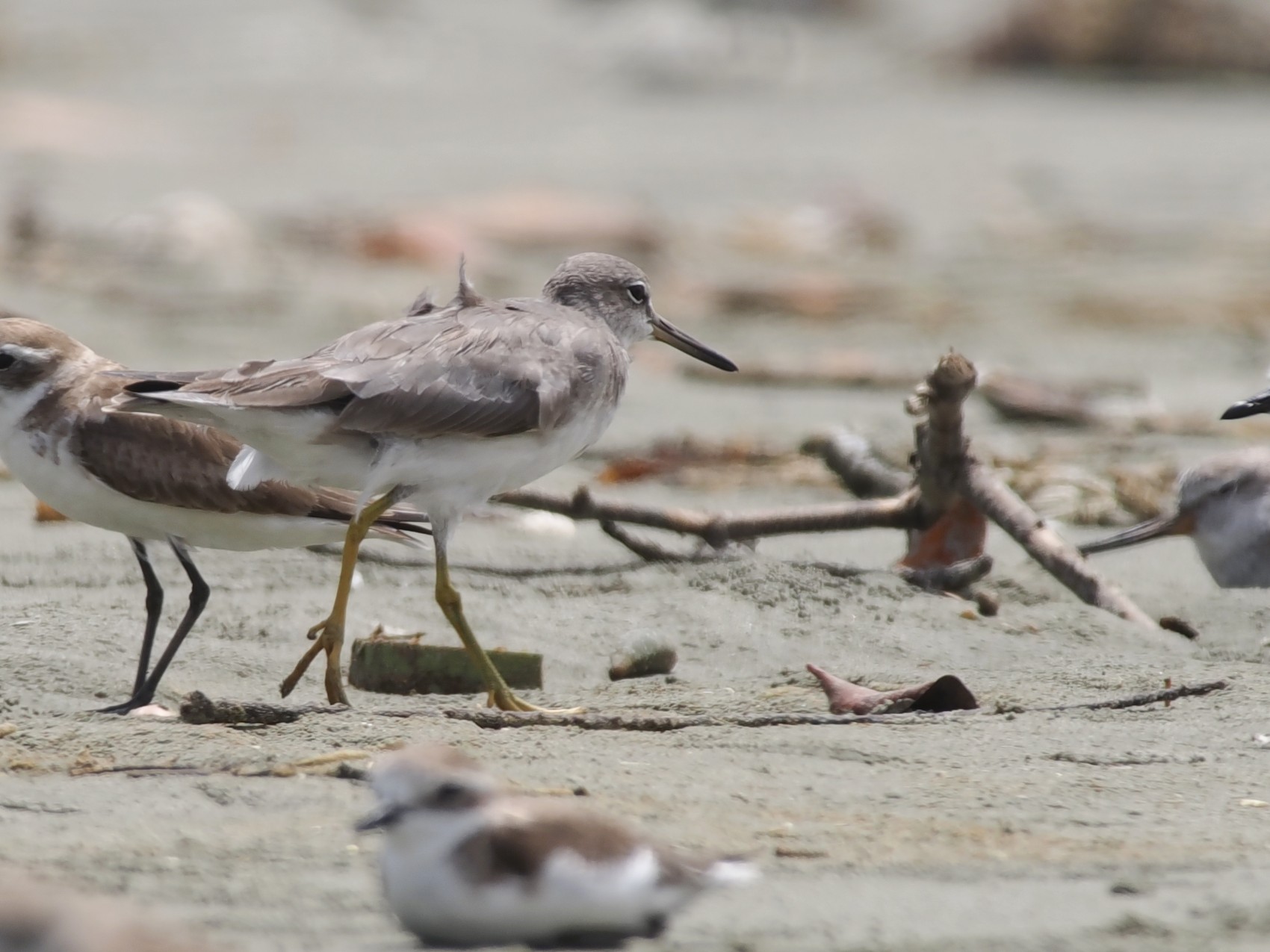 We swept our binoculars across the Terek crowd and caught a tiny glitch in the pattern. It appeared to be the Grey-tailed Tattler (Tringa brevipes)—its straight, chonky bill standing out among that sea of elegant curves.