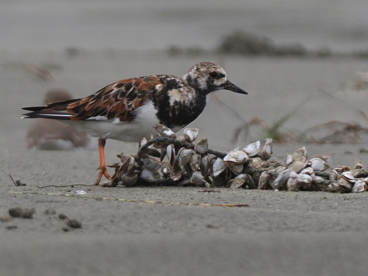 A group of Ruddy Turnstones (Arenaria interpres) worked busily along the sandy beach, flipping over a scattered necklace of seashells in their restless search for hidden morsels beneath.